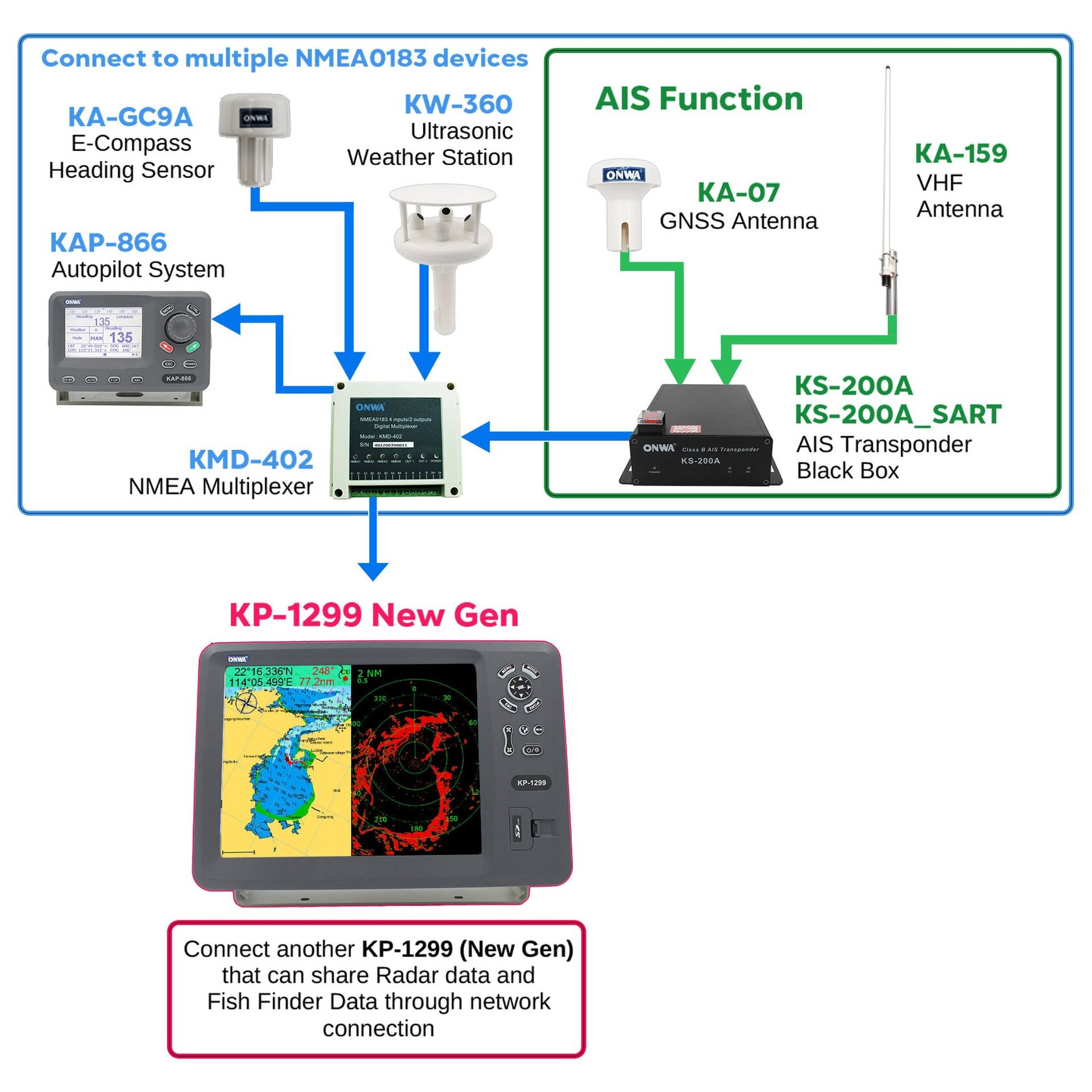 Отслеживать рыболовные лодки и небольшие коммерческие суда Может отправлять стандартное сообщение AIS и сообщение exactTrax ONWA AIS может подключить другие датчики к модулю AIS, такие как ультразвуковой датчик погоды и журнал скорости, для отправки с сообщением exactTrax *ПРИМЕЧАНИЕ: Чтобы использовать exactTrax, пользователь должен использовать ExactEarth Service.