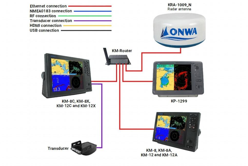 Функции радара передаются ВСЕМ устройствам в сети (радарная антенна ONWA должна быть подключена к KM-маршрутизатору в сети). ВСЕ устройства могут управлять радиолокационной антенной через KM-маршрутизатор.