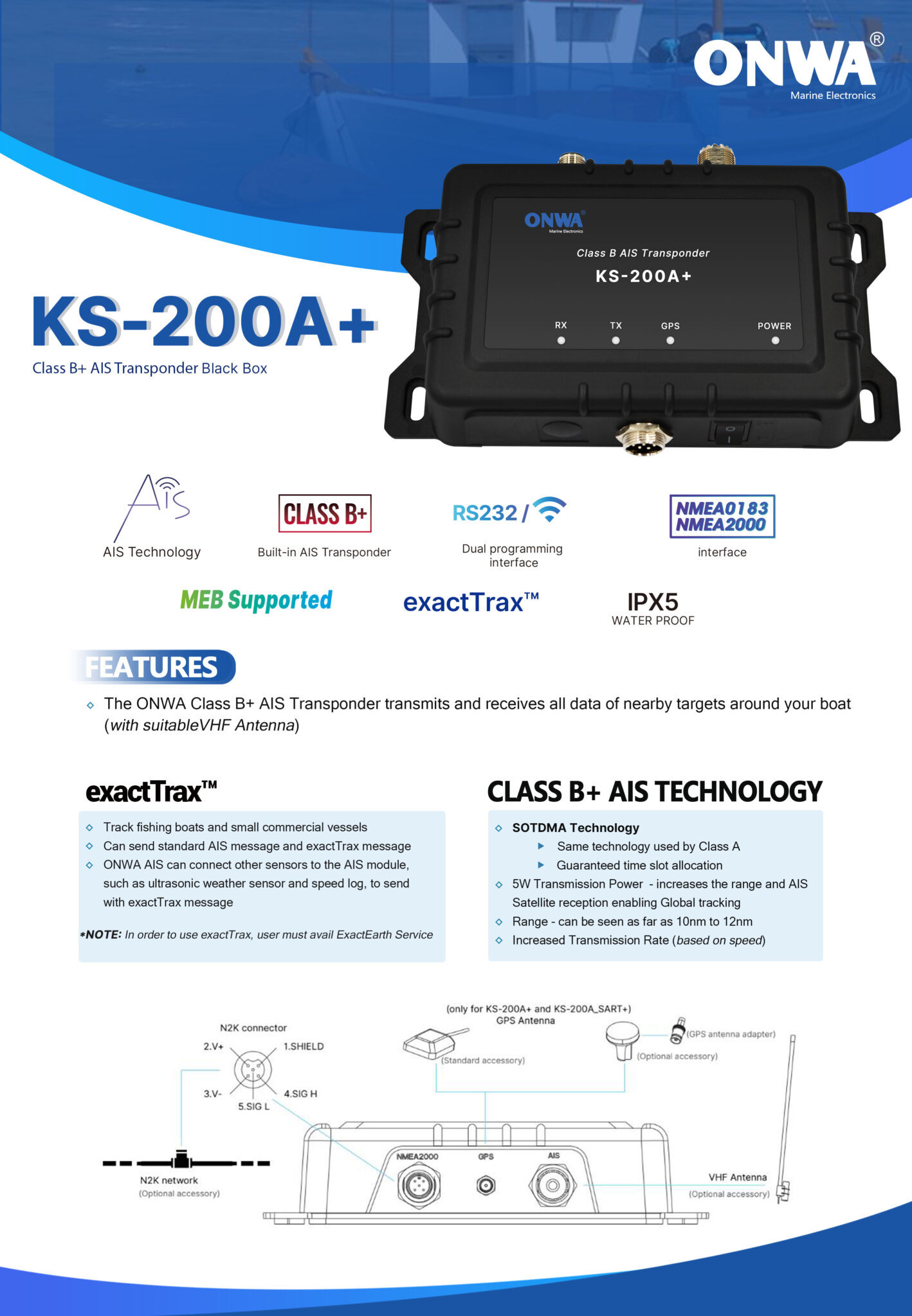 ONWA Marine Electronics рада сообщить, что транспондер KS-200A+ AIS Class B+ теперь доступен для заказа! Этот модернизированный транспондер AIS опирается на успех своего предшественника, KS-200A, включая передовые функции, предназначенные для повышения безопасности на море, связи и навигационной эффективности. Он идеально подходит как для коммерческих судов, так и для рекреационных лодочников, которые ищут надежное, высокопроизводительное решение AIS.
